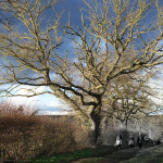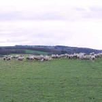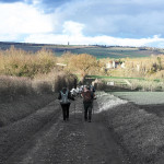Quand nous remontons sur le plateau par un chemin abrupte, la vue s’étend en direction de Charroux, Jean nous fait remarquer combien le groupe de marcheurs est paisible et détendu par ce bel après midi, autant que les moutons, nombreux mais que nous distinguons avec peine, génés par le contre jour.