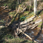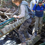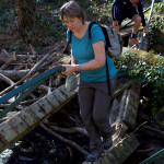 La passerelles permettant de franchir la rivière est détruite, un arbre est tombé dessus, c’est au prix de quelques acrobaties en passant sur un pylone de béton couché et en s’accrochant aux barres tordues du parapet que nous pourrons traverser.