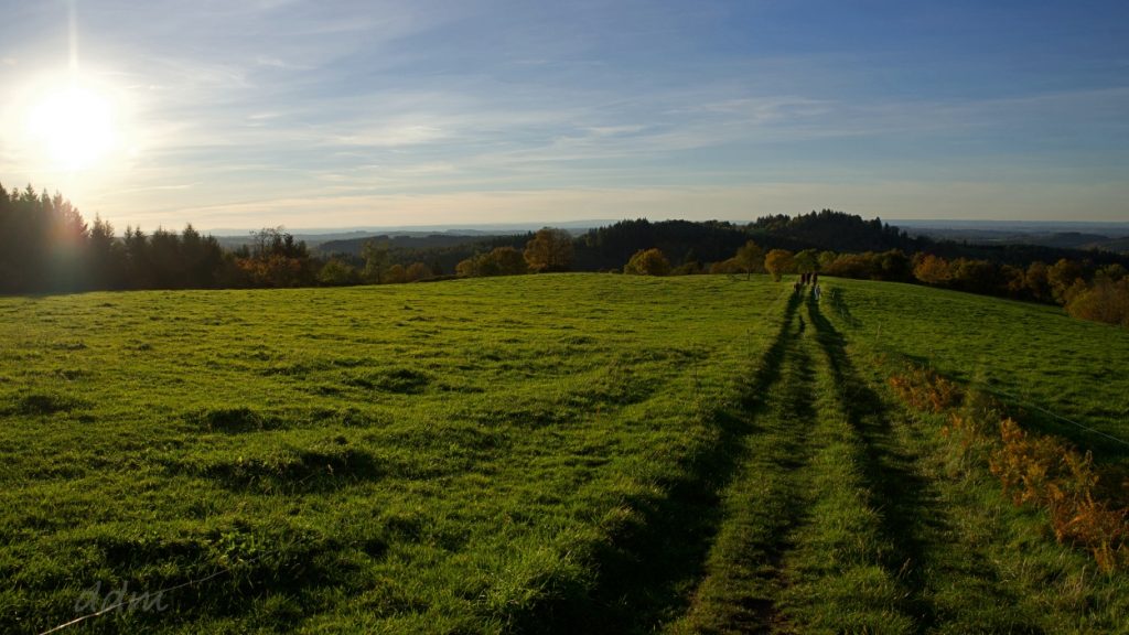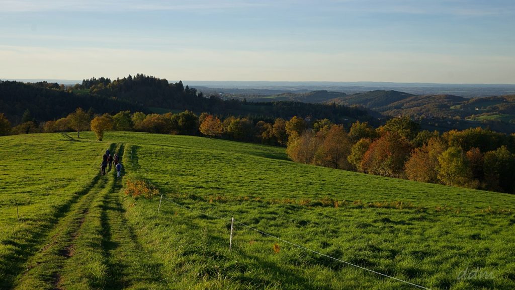 Lorsque nous abordons une descente à travers de grandes prairies, l’horizon s’élargit à 180° il est net, aucune trace de brume, la vue est immense sur la chaine des puys.