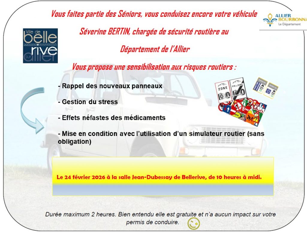 Un grand atelier de sécurité routière, ouvert à tous, se déroulera à Bellerive le mardi 24 février, de 10 à 12 heures à l’espace Jean-Dubessay. Une bonne occasion de réviser ses acquis et les bonnes pratiques de conduite. Au programme, rappels essentiels, échanges, « code blanc » et découverte avec un simulateur de conduite.