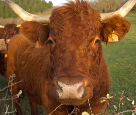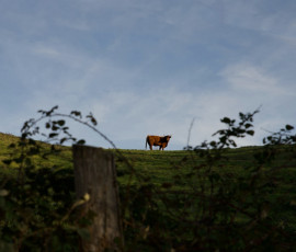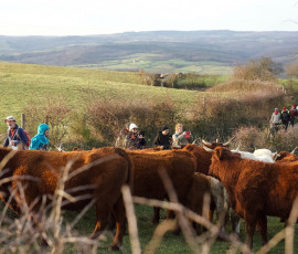 Après une forte montée ( courbes de niveau affrontées perpendiculairement ) nous rencontrons un autre troupeau, les vaches de Salers qui viennent à notre rencontre, derrière la barrière du pré !