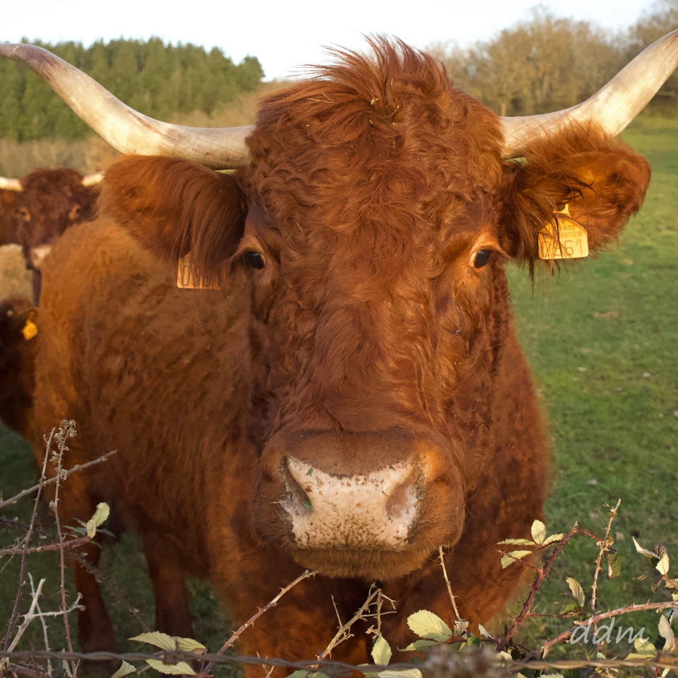 Après une forte montée ( courbes de niveau affrontées perpendiculairement ) nous rencontrons un autre troupeau, les vaches de Salers qui viennent à notre rencontre, derrière la barrière du pré !