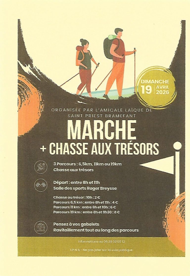 Le dimanche 19 avril 2026, l'Amicale Laïque de Saint-Priest Bramefant organise sa traditionnelle marche de Printemps. Venez nombreux pour partager...