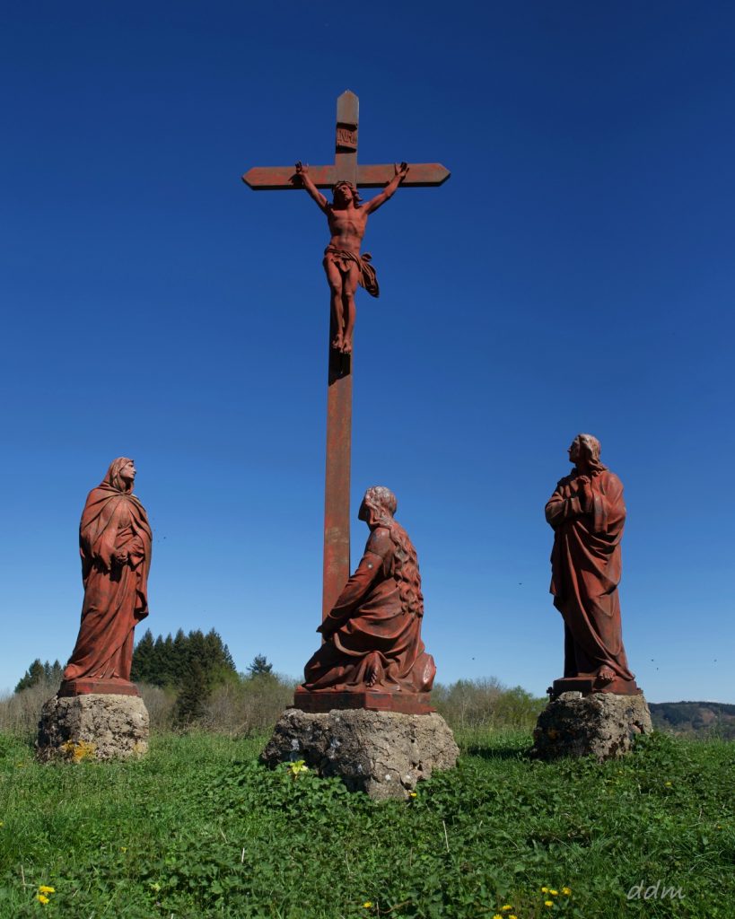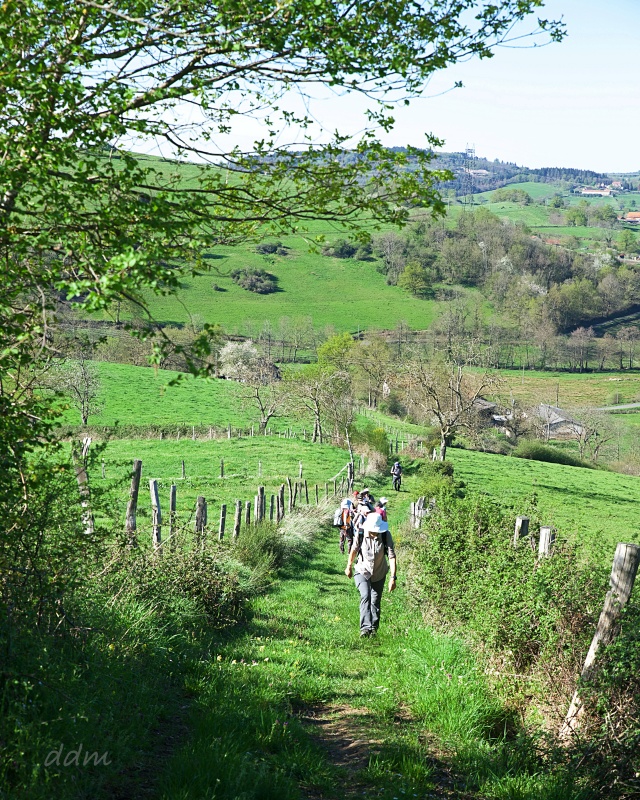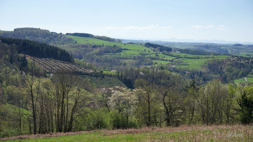 Très vite nous prenons de la hauteur par ce chemin herbeux et étroit. Il va nous amener tout prêt du Calvaire. La vue, presque à 360° est magnifique, nous sommes sur les contreforts de la montagne bourbonnaise.