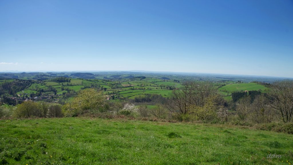 Très vite nous prenons de la hauteur par ce chemin herbeux et étroit. Il va nous amener tout prêt du Calvaire. La vue, presque à 360° est magnifique, nous sommes sur les contreforts de la montagne bourbonnaise.