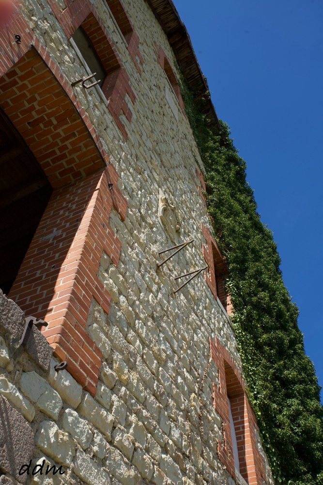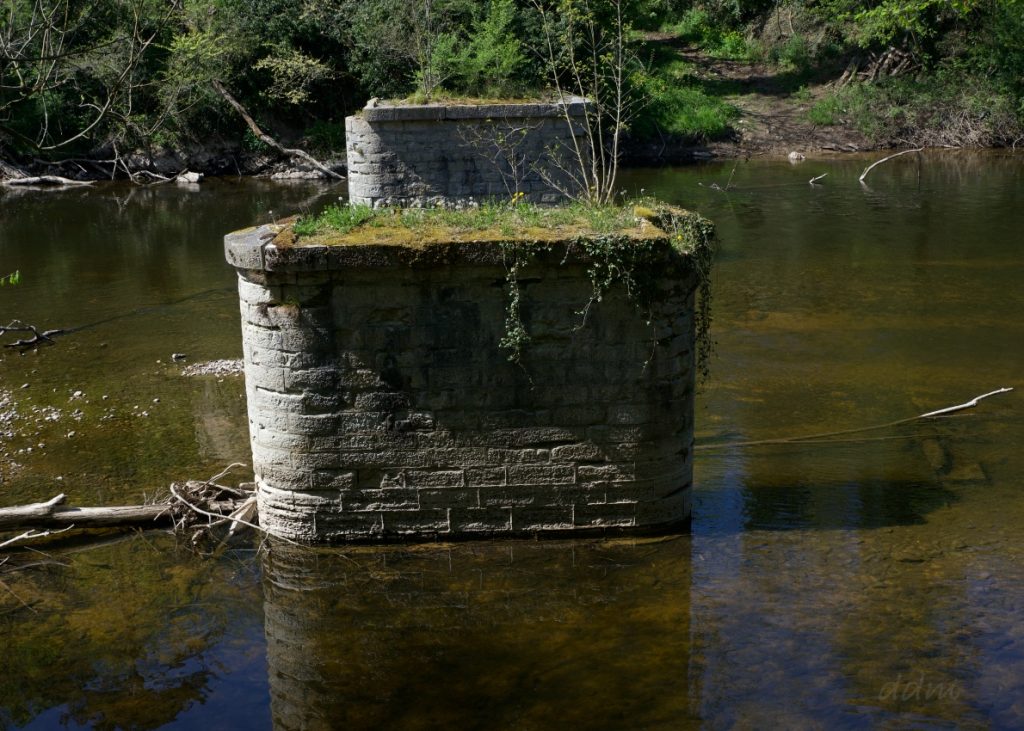Dans une agréable fraicheur nous longeons la rivière, Guy nous dirige vers le moulin des Oyes, ensemble de bâtisses de pierre et de briques, une chambre d’hôtes est située là, et nous aboutissons à un ancien pont dont il ne reste que les piliers de pierres plongeant dans la Sioule.